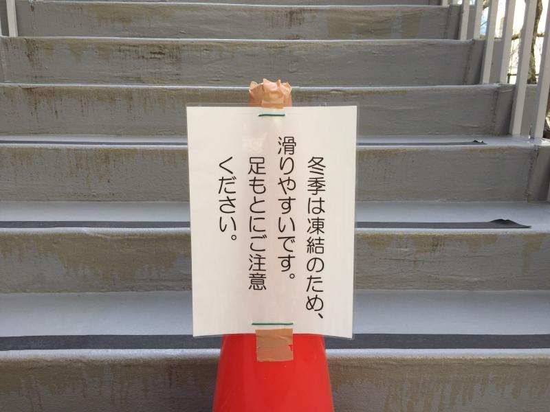 管理棟の外階段も凍結している事があり、注意書きの札が設置されました。