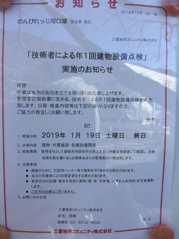 管理委託契約に定める、技術者による年1回建物設備点検を実施いたします。