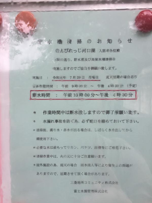 【重要】7月29日(月)貯水槽清掃(断水)のお知らせ(三菱地所コミュニティ㈱、富士水質管理㈱)