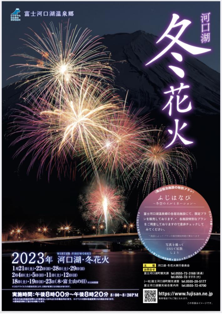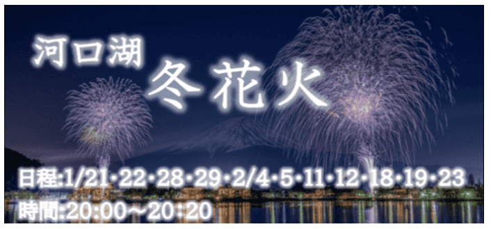 1月21日(土)~2月19日(日)、23日(木祝)は河口湖冬花火が開催されます。