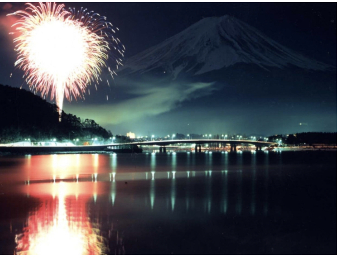 雪景色の富士山を背景に、冬の澄み切った夜空を彩る花火をお楽しみ下さい。