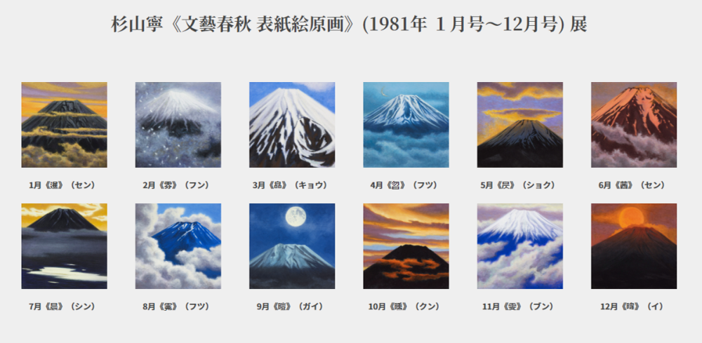 コレクションを代表する横山大観《蓬莱神山》、林武《赤富士》、小倉遊亀《霽れゆく》、東山魁夷《朝爽》、横山操《雪富士》、牛島憲之《赤い富士》、作宮杏奈《ユートピア》を初めとした人気の高い作品を展示するほか、この後期では新たに当館の収蔵作品となった杉山寧《文藝春秋 表紙絵原画》(1981年1月号~12月号) 展を同時開催いたします。