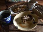 この日は1階にお客様が多かったのですが、たまたま2階は私たち夫婦だけの貸切状態になり、美味しいコーヒー、そば粉のワッフル、黒蜜ときな粉のコンニャクを頂きました。